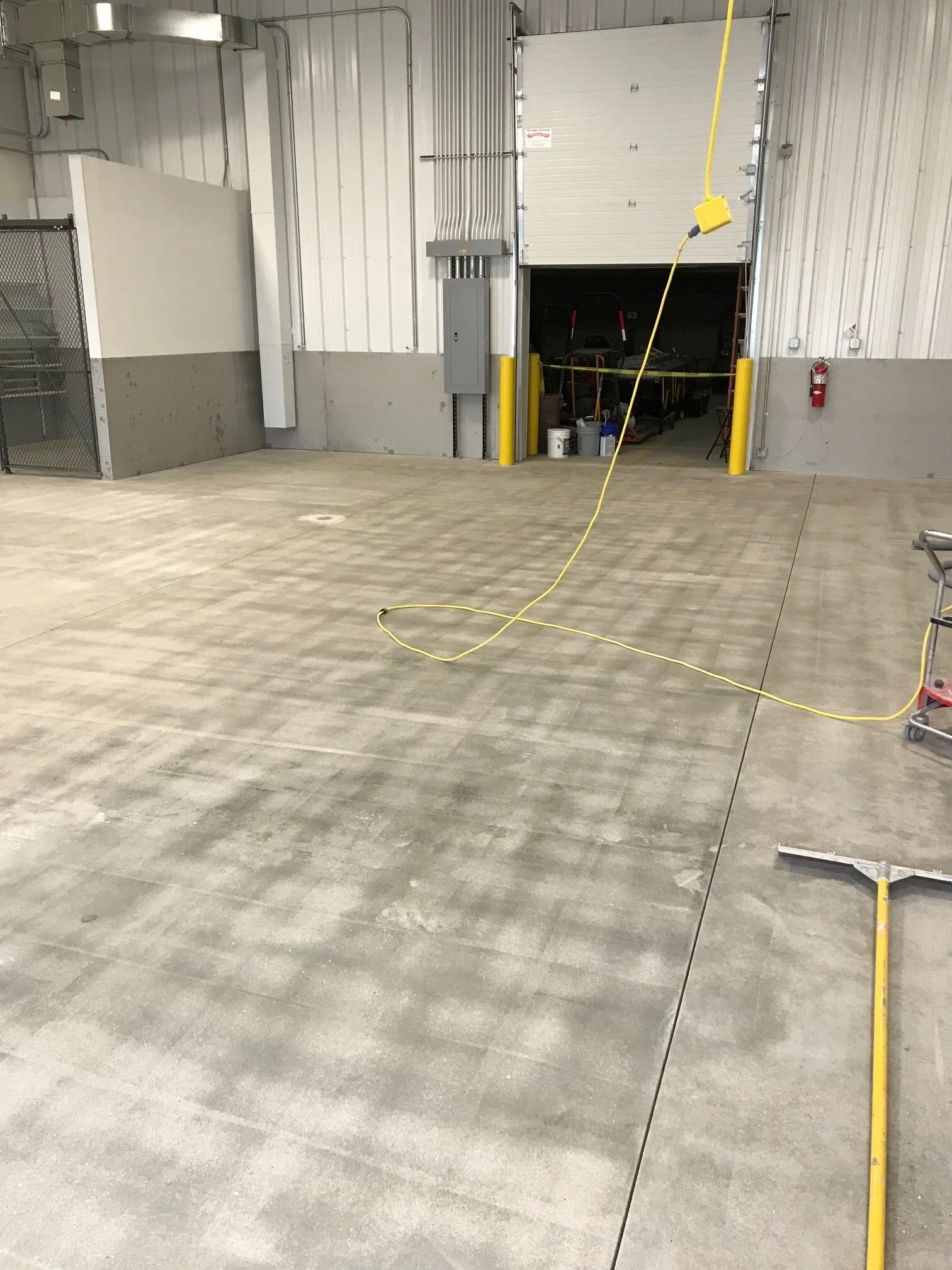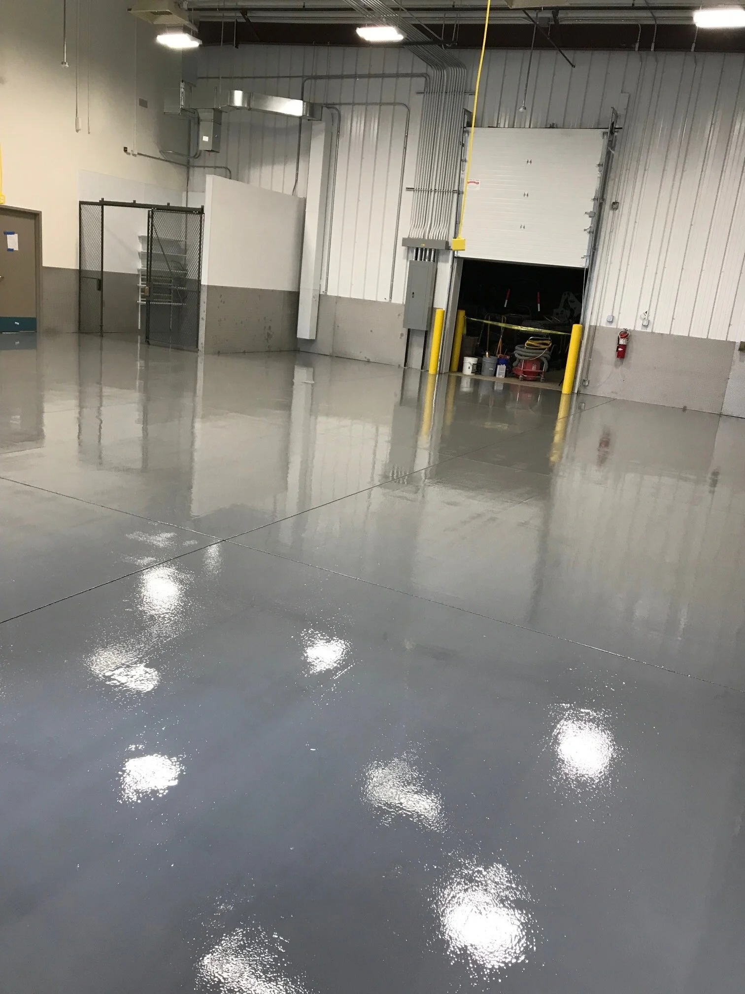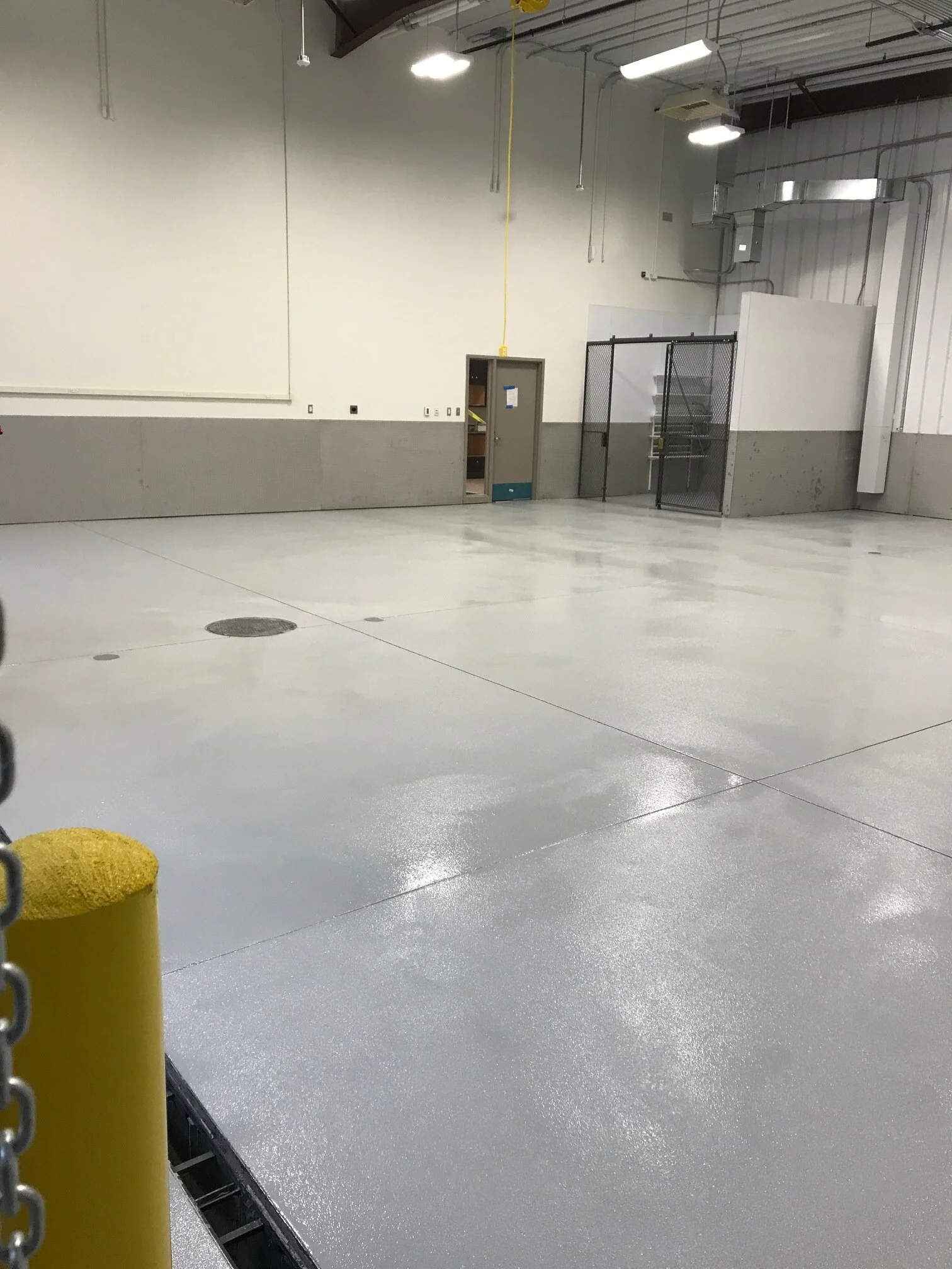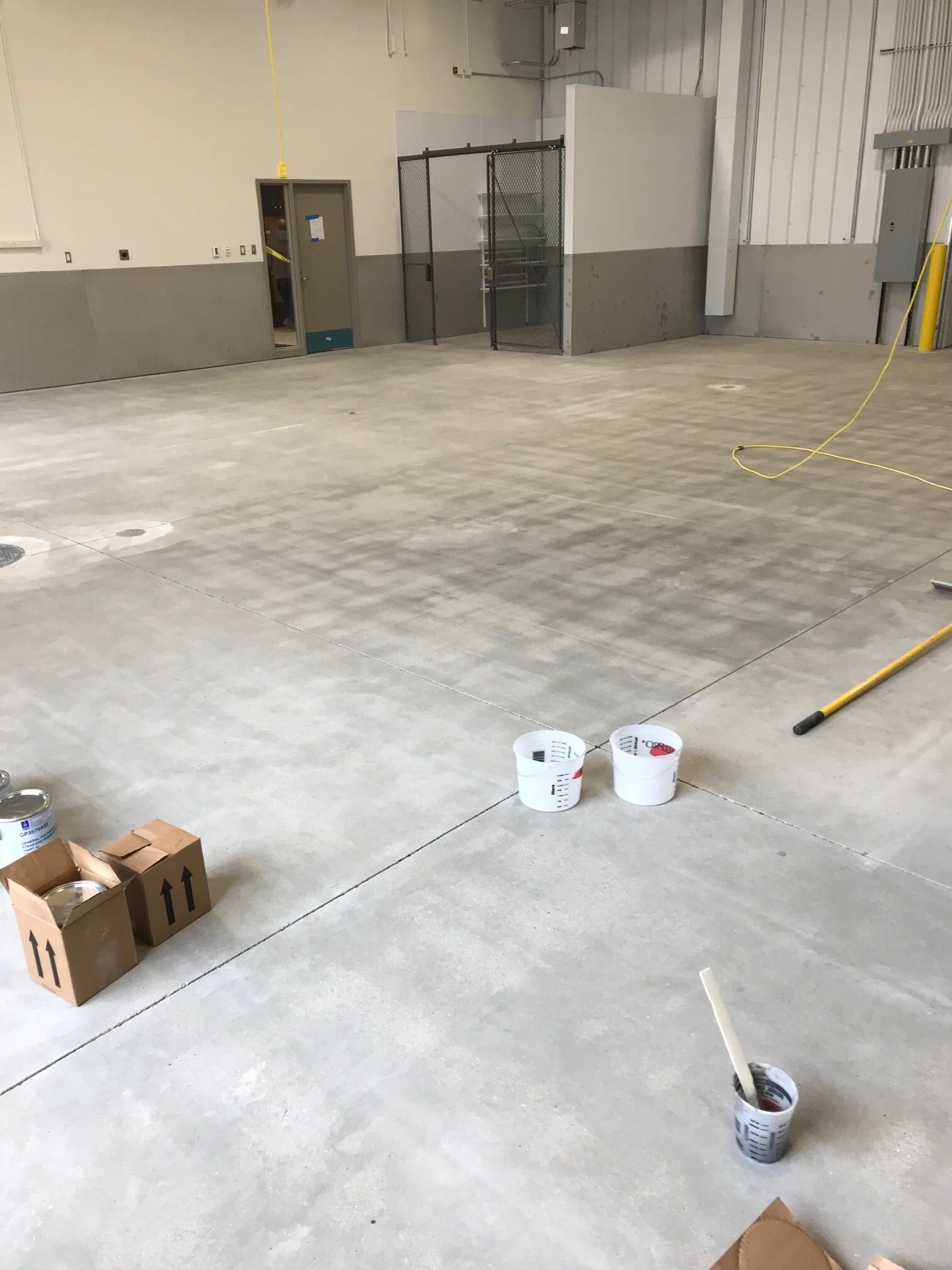This project was an old break room with a VCT tile. All the tile was removed exposing some large holes and cracks in the concrete. These were patched with a combination of Epoxy patch materials and urethane cement. All patchwork was diamond ground to a smooth surface and a three-coat 100% solids epoxy coating with anti-slip was applied.