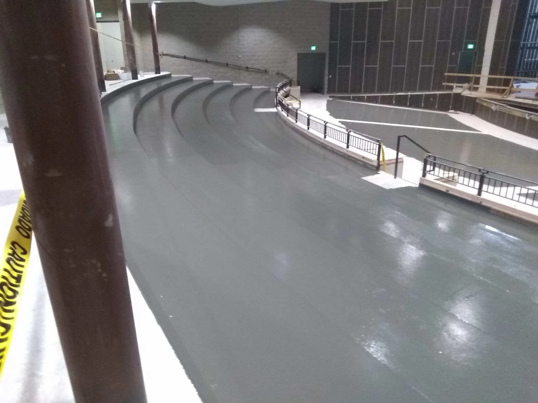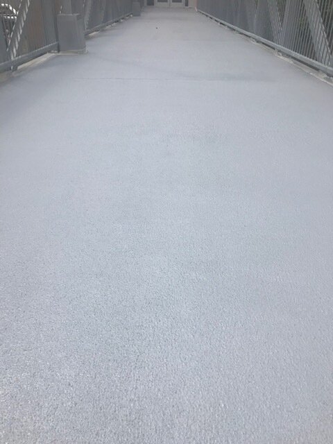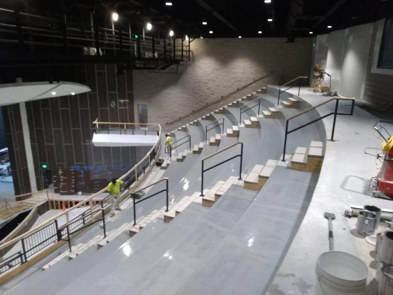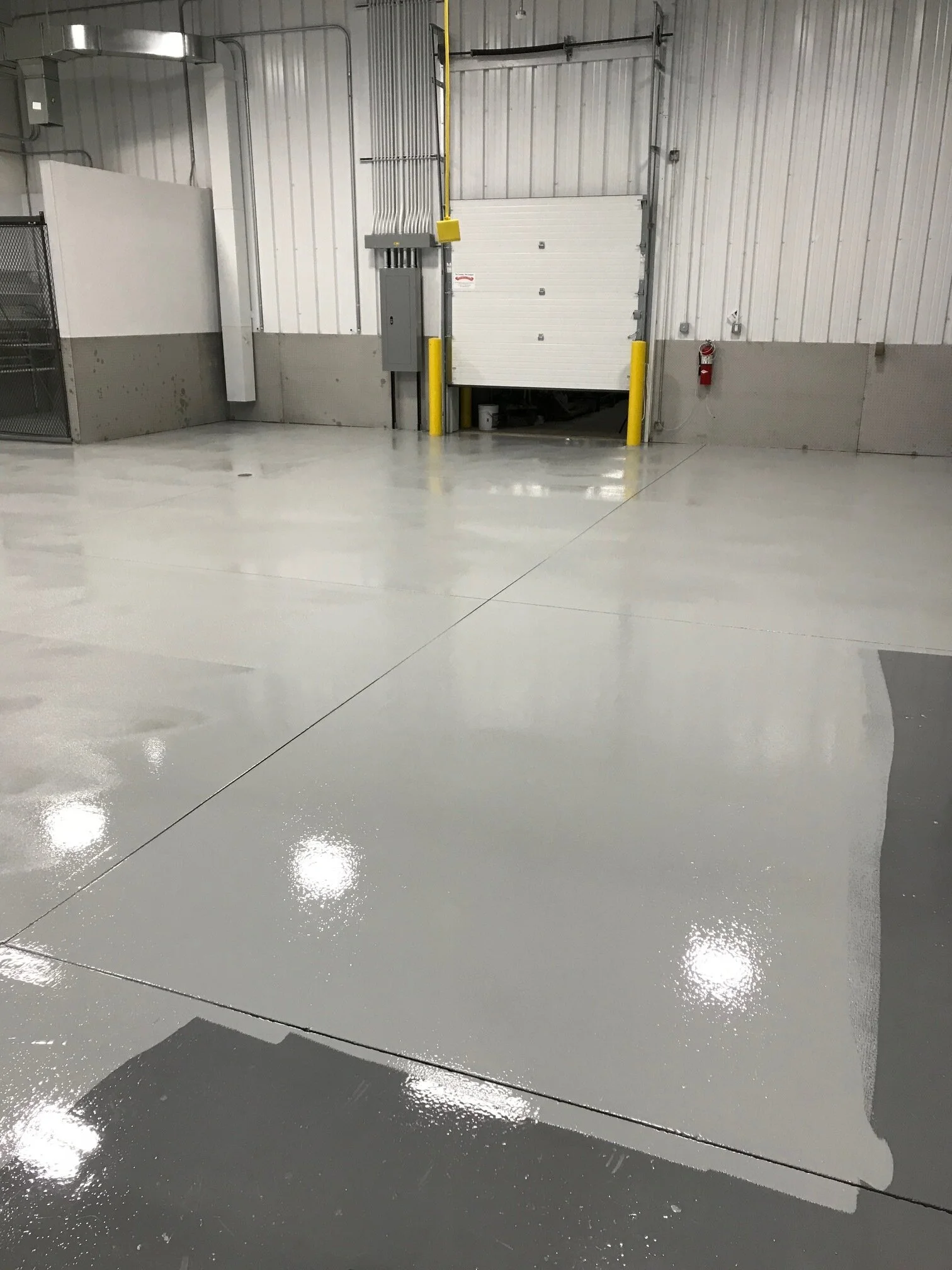 This project was an old break room with a VCT tile. All the tile was removed exposing some large holes and cracks in the concrete. These were patched with a combination of Epoxy patch materials and urethane cement. All patchwork was diamond ground to a smooth surface and a three-coat 100% solids epoxy coating with anti-slip was applied.