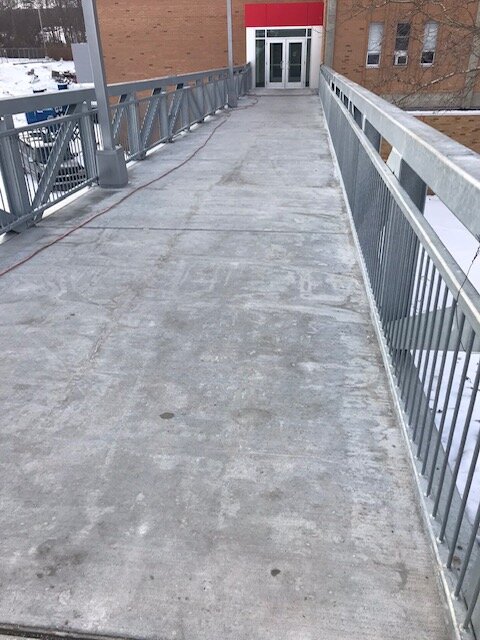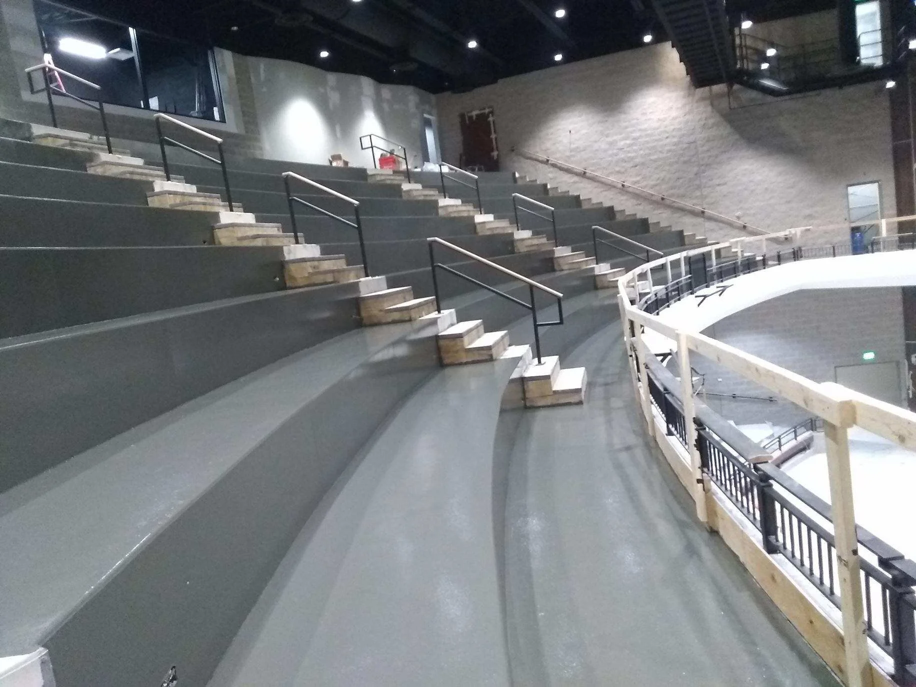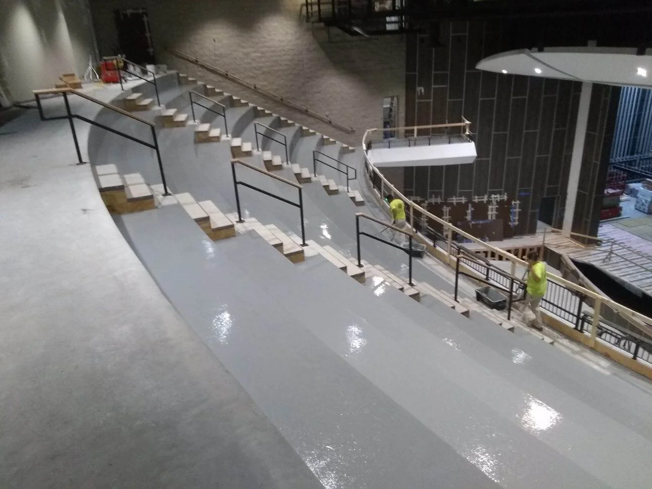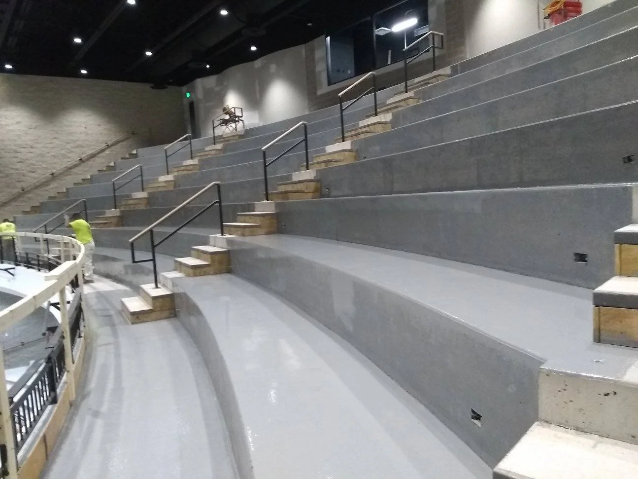 This project was an old break room with a VCT tile. All the tile was removed exposing some large holes and cracks in the concrete. These were patched with a combination of Epoxy patch materials and urethane cement. All patchwork was diamond ground to a smooth surface and a three-coat 100% solids epoxy coating with anti-slip was applied.